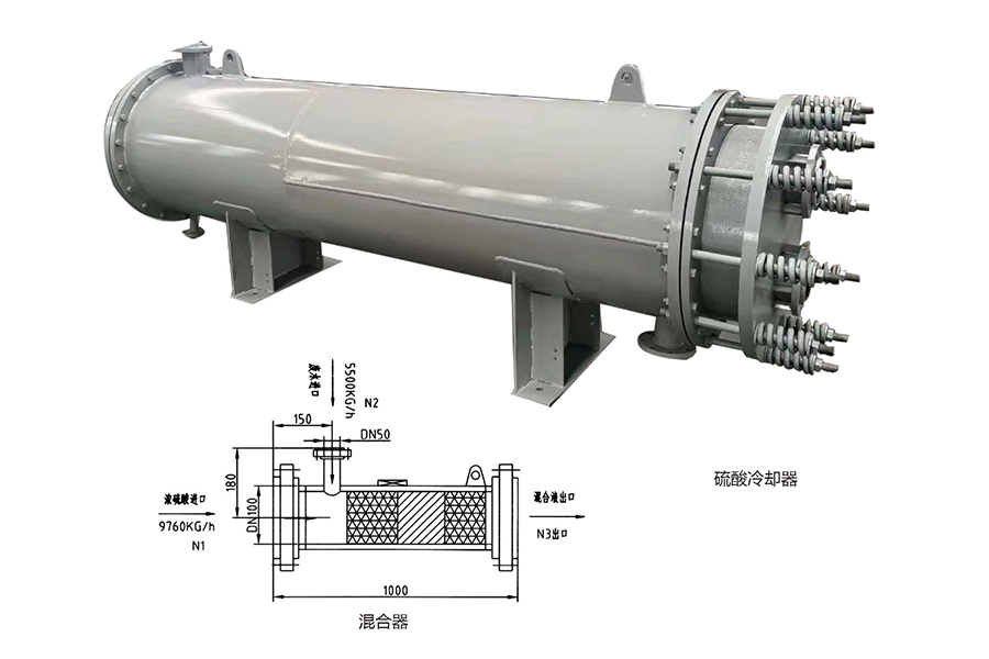 硫酸稀釋冷卻器結(jié)構(gòu):由混合器和冷卻器兩部分組成,混合器用于濃硫酸與軟水混合、稀釋、分配。冷卻器是將均勻混合后的高溫稀酸冷卻至所需溫度,本型為濃硫酸稀釋工藝中最為先進的設(shè)備,可將98酸一次稀釋到任意濃度,并且稀釋后直接進行冷卻至50℃以下,該裝置可以根據(jù)客戶需求進行全自動控制設(shè)計或模塊單元裝置交付。
