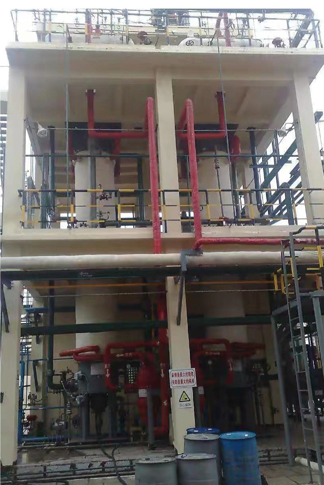 氯氣與氫氣反應(yīng)生成氯化氫時(shí),釋放出大量反應(yīng)熱,完全可以用來副產(chǎn)蒸汽。公司開發(fā)出全自控副產(chǎn)0.3-0.5MPa蒸汽氯化氫合成裝置,氯化氫合成爐從上到下由冷卻段、副產(chǎn)蒸汽段和合成段三部分組成。合成爐副產(chǎn)蒸汽段位于高溫區(qū)段,采用全石墨爐筒或鋼制水冷壁爐筒;在合成段頂部和底部鋼材容易受腐蝕的區(qū)段,采用石墨材料制作;既克服了石墨爐筒強(qiáng)度低和使用溫度受限制的缺點(diǎn),又克服了合成段和冷卻段容易腐蝕的缺點(diǎn)。該裝置全自動(dòng)DCS控制,遠(yuǎn)程自動(dòng)點(diǎn)火,氫氣和氯氣自動(dòng)配比控制,制酸自動(dòng)控制,具有多種安全連鎖保護(hù)系統(tǒng);在保證正常工藝操作條件的情況下,能保持長(zhǎng)時(shí)間穩(wěn)定的運(yùn)行,企業(yè)可按正常的檢修計(jì)劃作業(yè),避免了非正常的停車檢修,為企業(yè)節(jié)省了大量的檢修費(fèi)用和非正常停車所造成的損失。